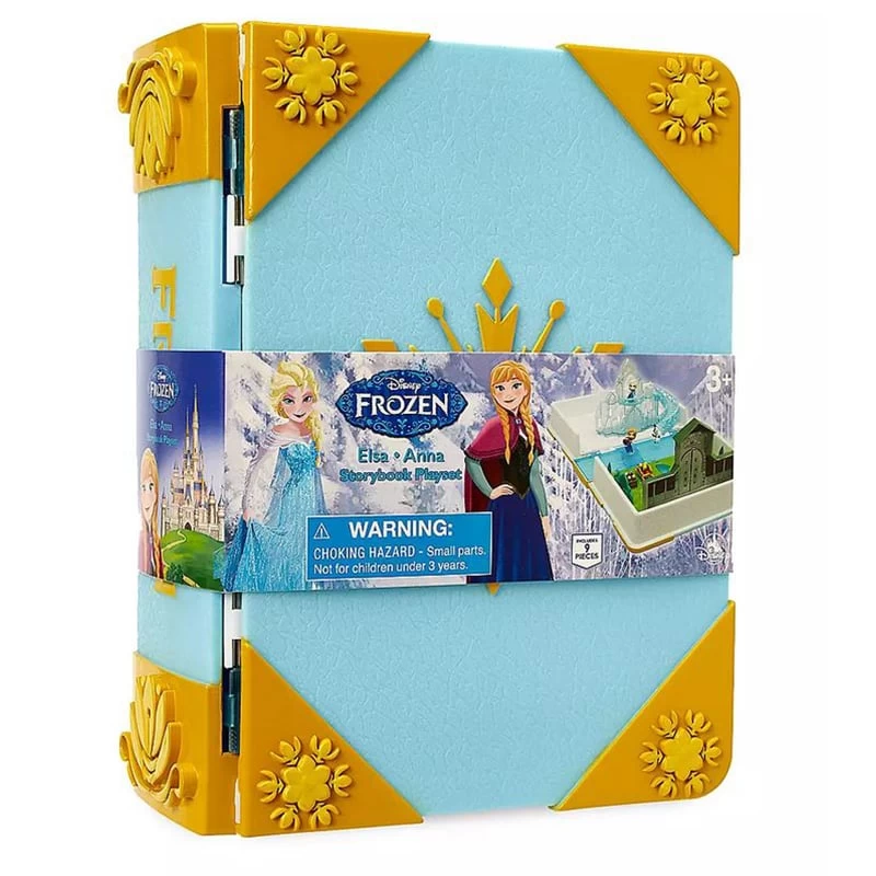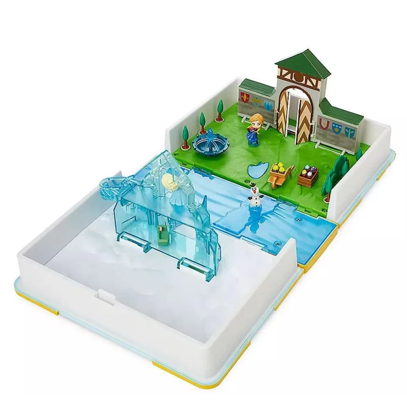 - Storybook playset opens to reveal gates of Arendelle Castle, front of Elsa’s ice castle, and an ice rink settings