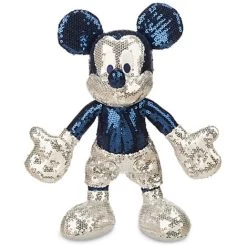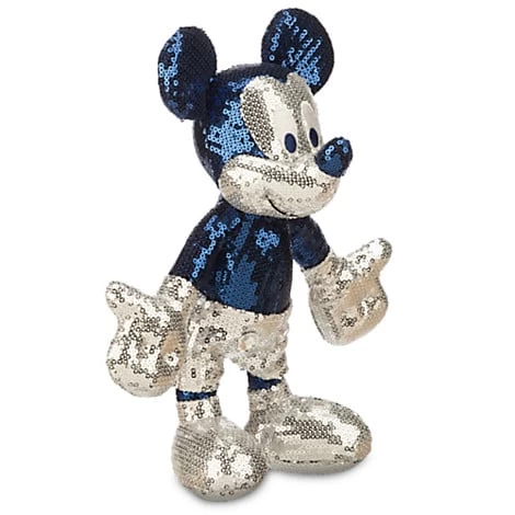 Mickey really shines in the spotlight of Disneyland’s 60th Birthday with this silvery sequined plush souvenir, accented by faceted gem ”buttons” on his classic shorts and an embroidered ”D” icon underfoot.